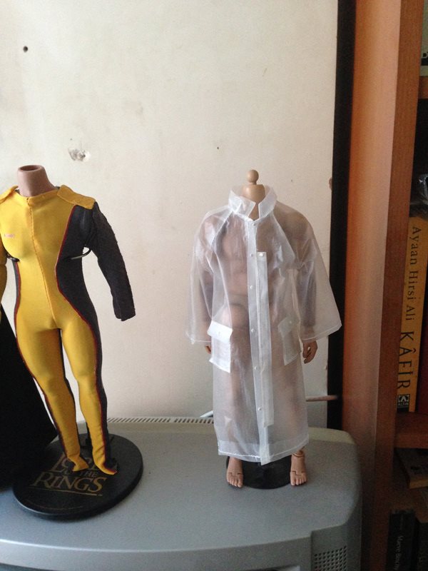Handmade 1/6 scale Patrick Bateman raincoat, tailored on a hot toys body. Material is a little fragile, made from wear and tear geunine raincoat material. So pros and cons, your figure will really be waterproof ha ha, but it is a little fragile so put it on the figure slowly.